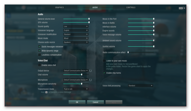 В разделе «Аудио», пользователь может изменить уровень звука и источник входа, выхода. Если союзники издают странные звуки в голосовой связи, то их можно отключить, убрав галочку с пункта «Включить голосовой чат».