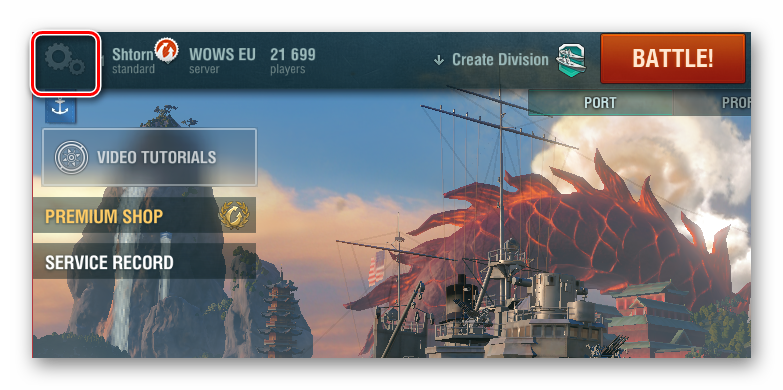 Заходим в игру под своим аккаунтом Wargaming. После включения игрока перенесут в порт — это аналог ангара с танками. Чтобы войти в настройки нажимаем на клавишу «Esc» или на иконку шестерёнки в левом верхнем углу. Откроется меню с несколькими пунктами, кликаем на «Настройки».